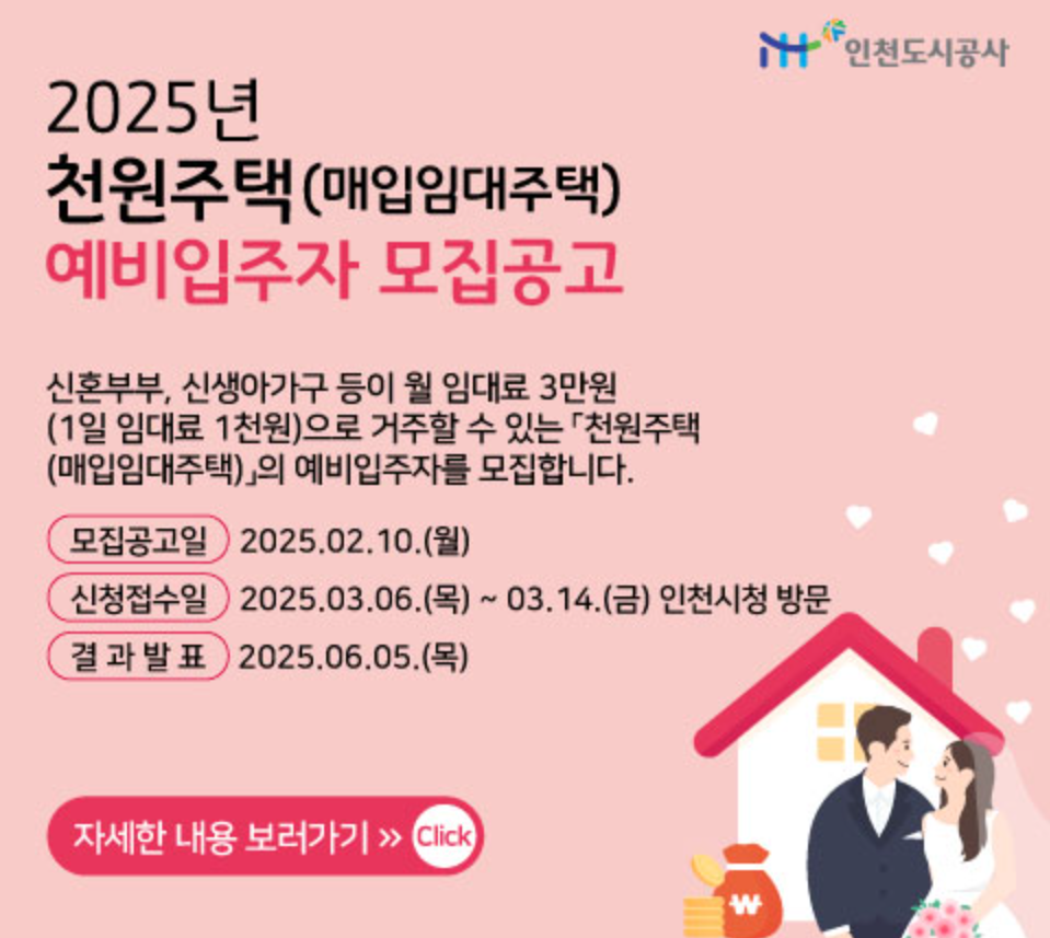 천원주택은 인천시가 신혼부부와 한부모 가정의 주거 안정을 돕고, 출산율 증가를 유도하기 위해 도입한 공공임대주택 정책입니다.