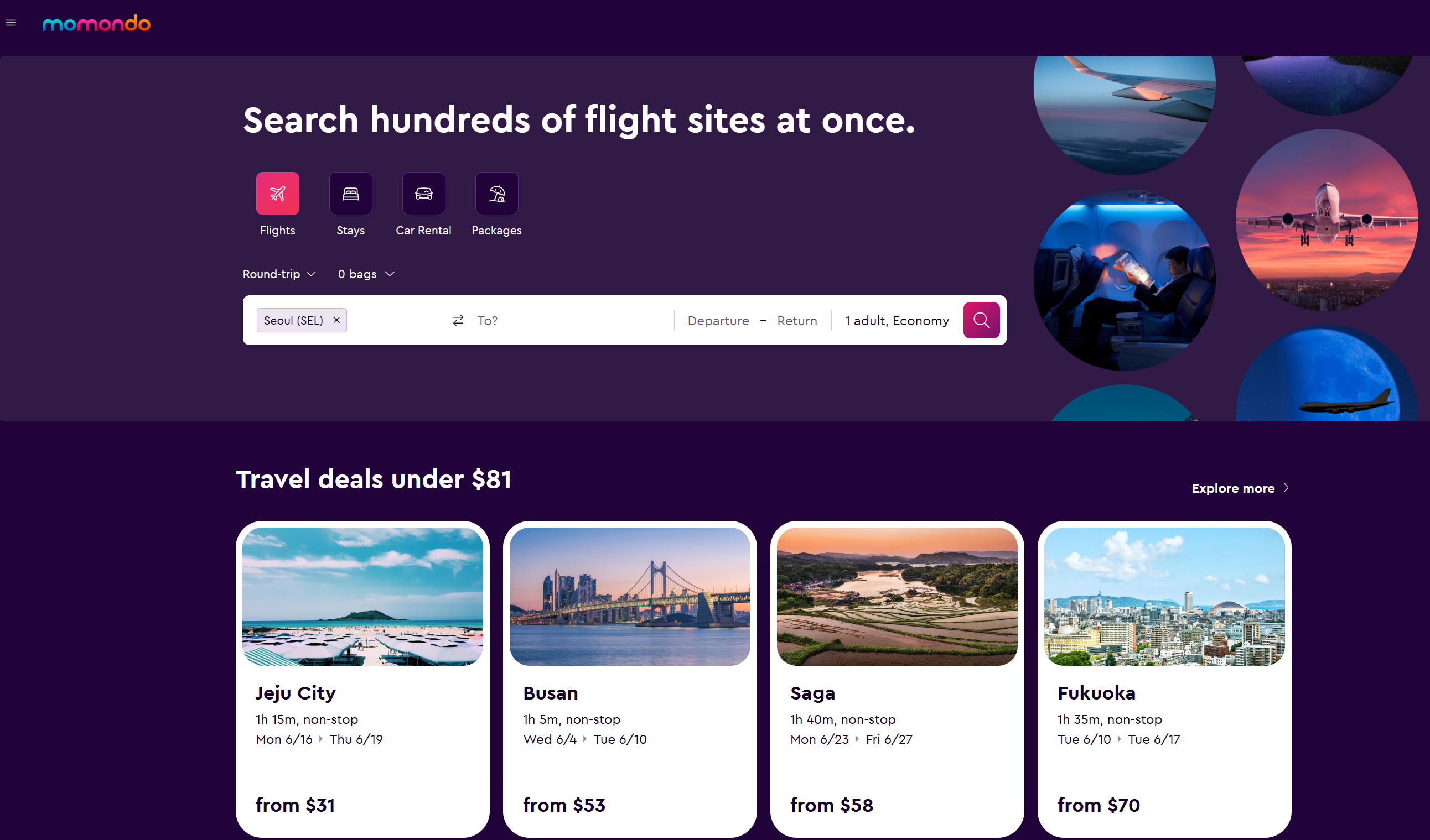 - 특징: 다양한 항공권, 호텔, 렌터카 정보를 비교 검색하며, 'Hacker Fares'라는 편도 항공권을 조합하여 더 저렴한 가격을 제시하는 기능이 유용합니다.
