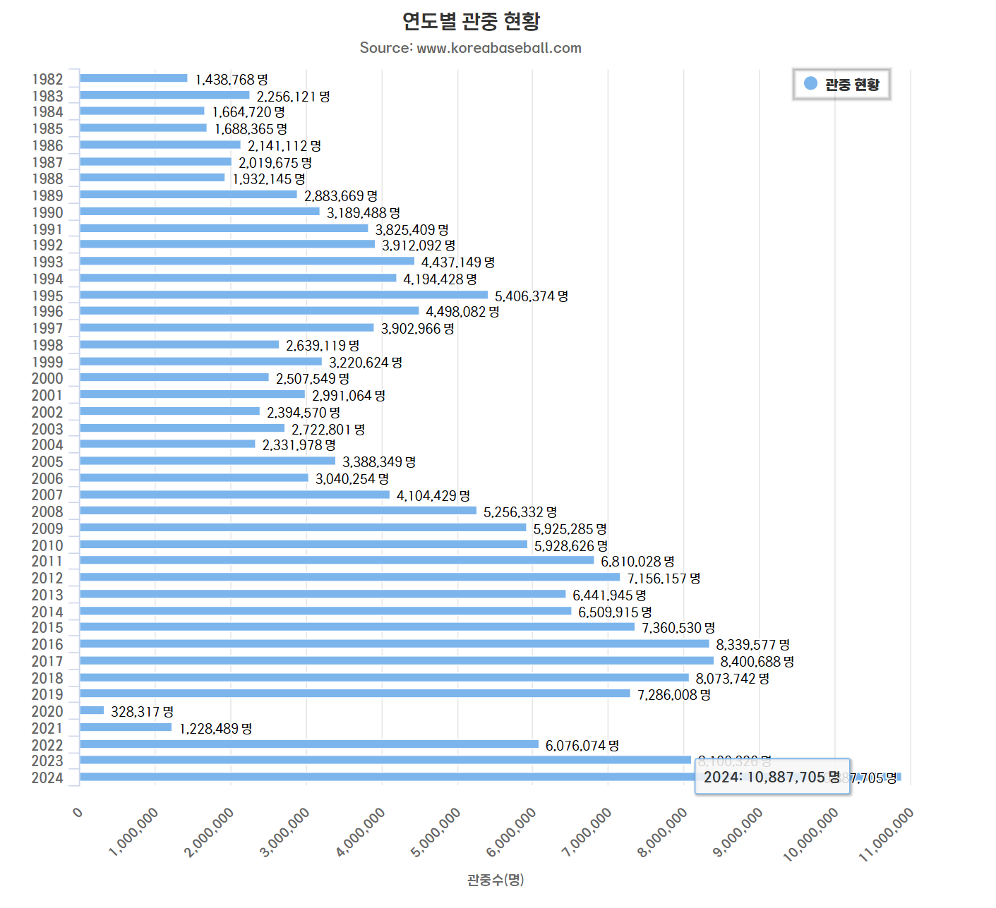 2024년 시즌 KBO 리그의 총 관중 수는 900만 명을 돌파하며, 코로나19 이전 수준을 완전히 회복했다. 이는 2023년(800만 명)보다 약 12% 증가한 수치로, 야구장의 열기가 다시 뜨거워졌음을 의미한다.